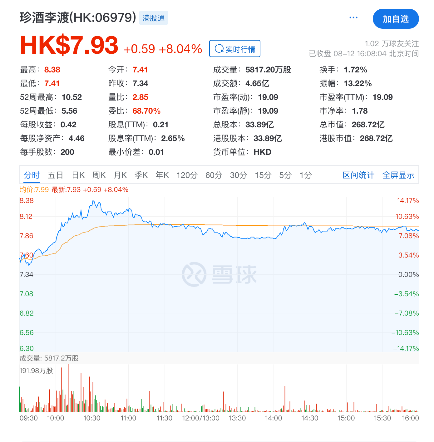 對于珍酒李渡來說,不管這些舉措的最終成效如何,目前“牛市”確實挺牛,竟在資本市場完全抵消了慘淡業(yè)績帶來的影響。8月4日“牛市”發(fā)出上市預(yù)告,珍酒李渡的股價連續(xù)三天上漲,累計漲幅達(dá)14.24%。8月6日,“牛市”正式亮相,公司股價繼續(xù)上揚(yáng)。8月12日,珍酒李渡在盤中一度漲超11%,截至收盤,漲幅稍回落至8%,每股報7.93港元,總市值約268.72億港元。