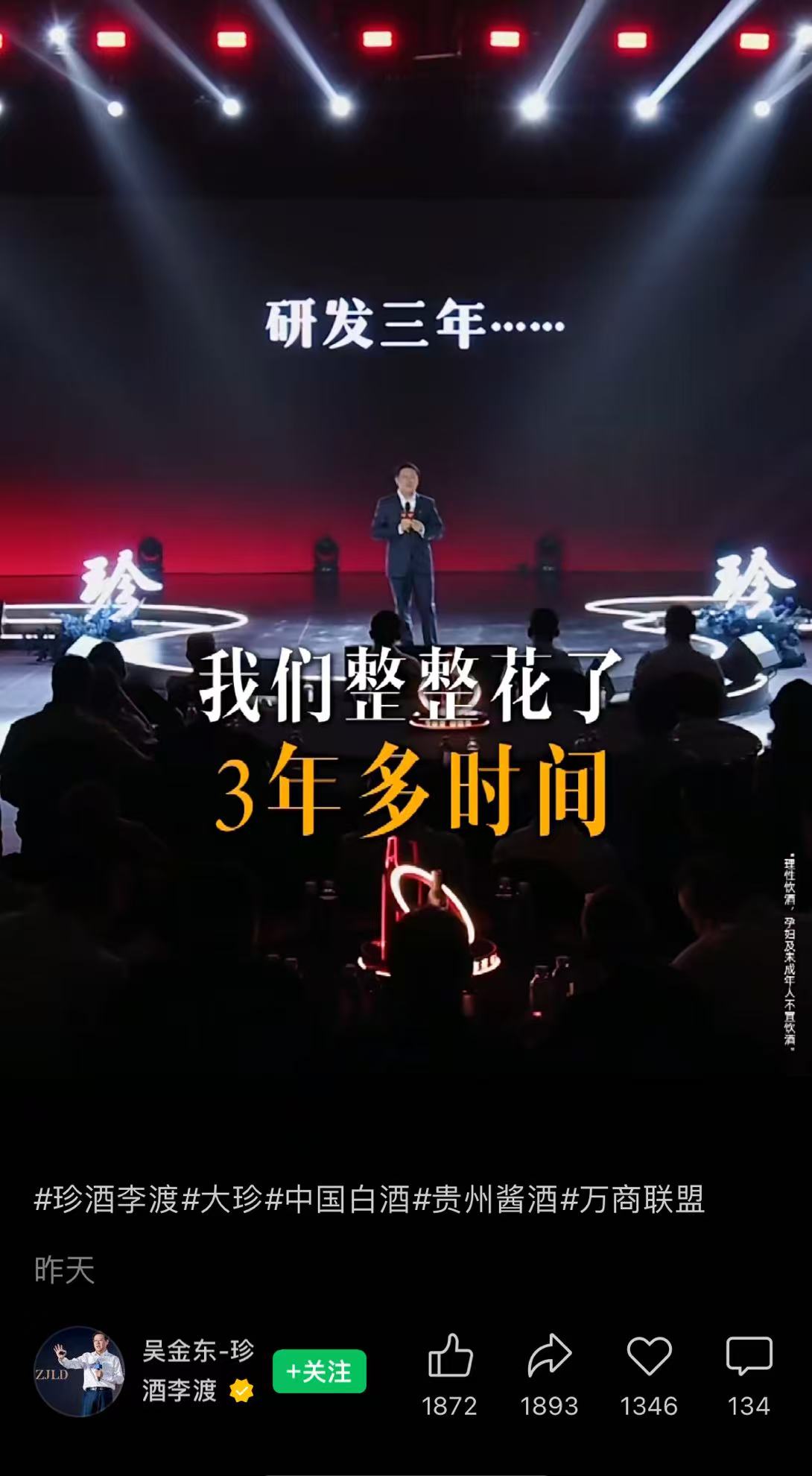 將目光重新聚焦至珍酒李渡,其自救策略顯然并不止于發(fā)力啤酒。今年6月,珍酒李渡推出戰(zhàn)略級大單品“大珍·珍酒”,定價888元,并官宣姚安娜擔(dān)任白酒“申遺大使”。這款光瓶酒試圖抓住光瓶酒熱潮,公司宣稱將絕大部分預(yù)算向其傾斜。吳向東本人也在近幾個月越來越活躍,甚至親自下場出鏡拍短視頻,開始打造個人IP。